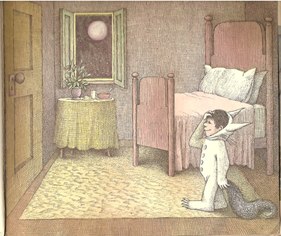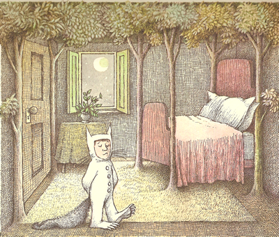 a "wild rumpus" in the forest, which is still his bedroom.